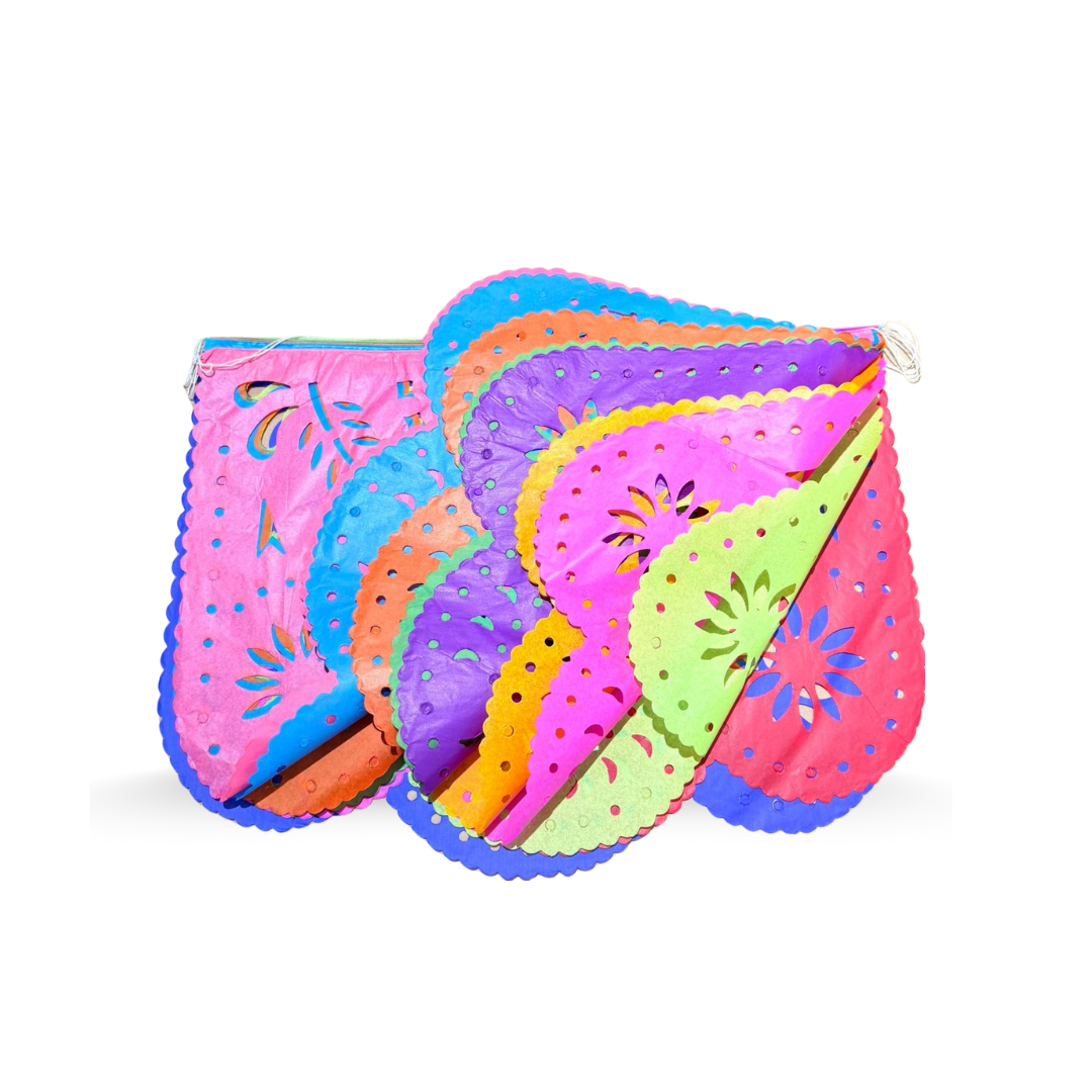 Papel Picado mit mexikanischen Farben sind die perfekten Farben zur Dekoration mexikanischer Fiestas! Diese kunterbunte Girlande bringt Mexiko zu Ihnen nach Hause und darf auf keiner mexikanischen Themenfeier fehlen. Traditionell wird zum Beispiel auf Volksfesten, zu Weihnachten, am Tag der Toten, aber auch zu Hochzeiten und Taufen mit „Papel Picado“ geschmückt. Da für die Herstellung aufwändige Designs in Seidenpapier geschnitten werden, gilt Papel Picado in Mexiko sogar als Volkskunst.