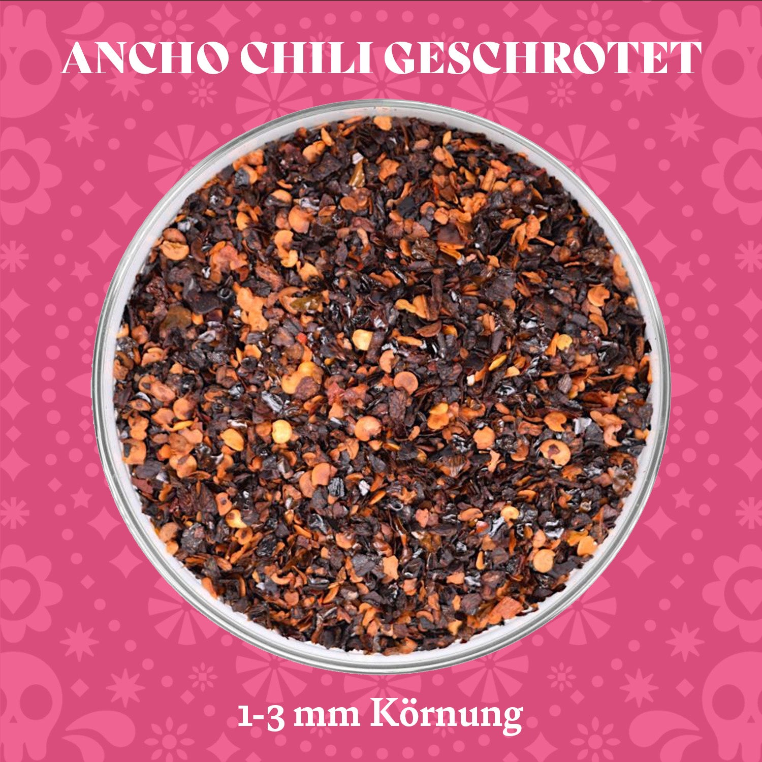 Als Ancho wird die getrocknete Variante des aus Mexiko stammenden Poblano-Chilis bezeichnet. Diese vor allem in Mexiko beliebte, sehr milde Chilisorte trägt sehr große Früchte, die bis zu 15 cm lang und 7 cm dick werden. Die unreifen Früchte sind grün und verfärben sich mit zunehmender Reife dunkelrot bis fast schwarz. Während der unreife, grüne Poblano-Chili meist frisch verarbeitet wird, werden die vollreifen, dunklen Früchte getrocknet. Jetzt heißt die Frucht Ancho (spanisch für Breite), weil sich die Chili in eine flache, sehr breite und herzförmige Schote verwandelt. Die getrockneten Schoten werden gemahlen oder geschrotet angeboten. Die sehr milde Sorte hat einen fruchtigen, fast süßlichen Geschmack, der an getrocknete Rosinen, Lakritz, Tabak und Kaffee erinnert. Ancho wird gerne mit schärferen Chilisorten kombiniert, um die Gesamtschärfe deutlich zu reduzieren.